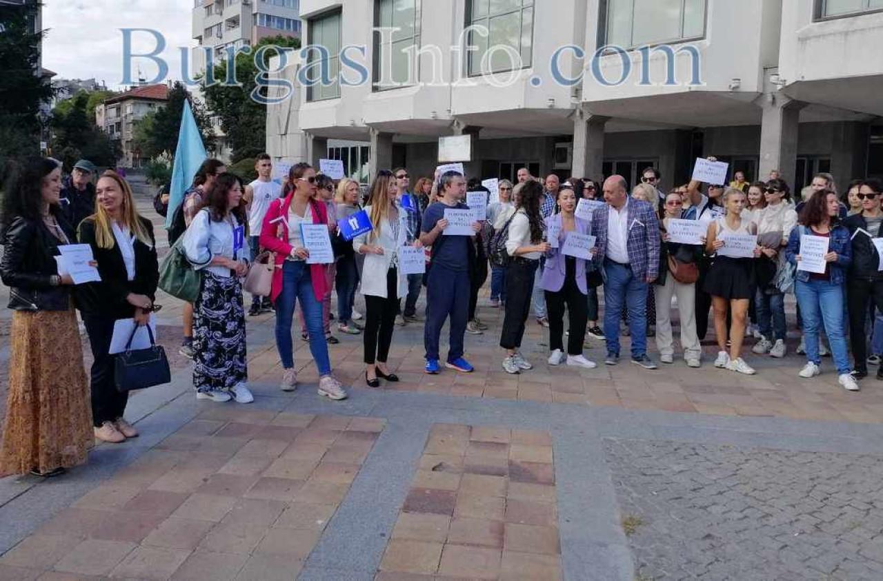Протестът е организиран от КТ „Подкрепа“ и Национална федерация „Култура“. Тук имаме представители в Операта, Регионален исторически музей, в Библиотеката. Много се радваме, че ни подкрепиха колегите от Кукления театър“, каза Антония Тодорова – регионален секретар на КТ „Подкрепа“ в Бургас.
