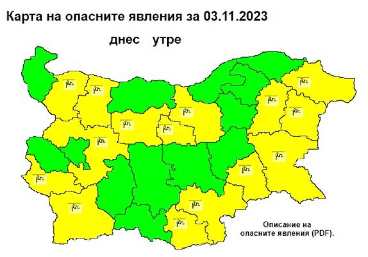 В голяма част от страната утре ще духа силен южен вятър, чиято скорост на моменти ще надхвърля 80 километра в час. Затова за много области е в сила жълт код за опасно време. Утрото ще бъде хладно с температури от 5-6 градуса в котловините до 11-12 градуса край морето.