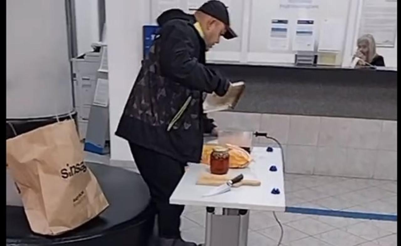На видеото се вижда как той влетява в офиса на електроразпределителното дружество с хляб, дъски за рязане, нож, хранителни продукти и малка скаричка.