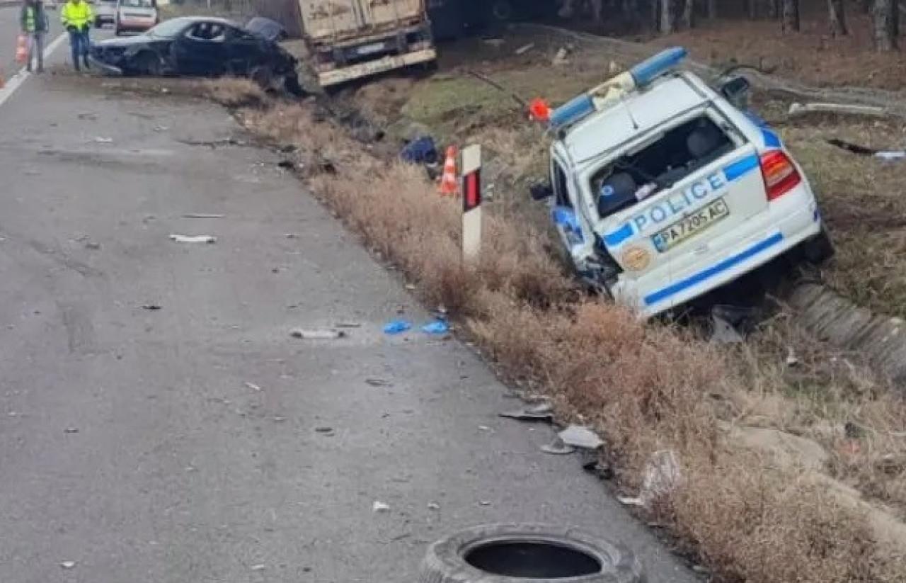 На мястото на катастрофата има полиция, пожарна и линейки. Полицейският автомобил е бил на магистралата заради друг аварирал автомобил. Полицаите са били обозначили мястото на инцидента с конуси.
