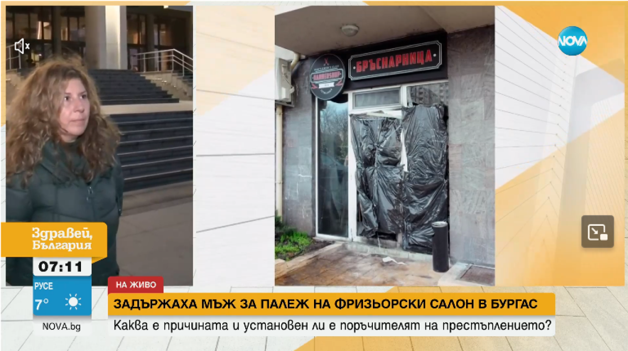 Районната прокуратура в Бургас задържа за срок до 72 часа млад мъж, обвинен в палеж на фризьорски салон. Престъплението е извършено час след полунощ на 1 януари в един от големите затворени комплекси в морския град. Разпитан е и свидетел.