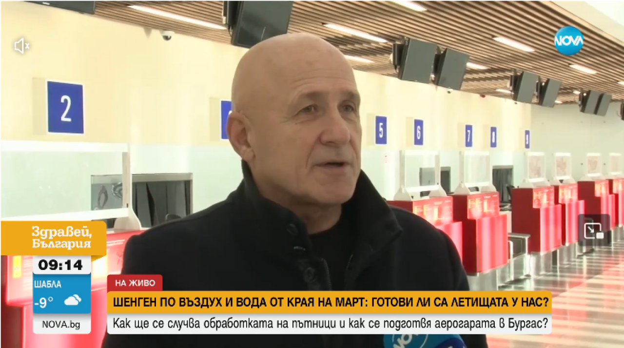 „Нашата подготовка за адаптиране на инфраструктурата не е стартирала тази година. Още през 2010 г., когато бяха първите проверки, подготвихме Терминал 1 с разделяне на потоците. Опашките, които се образуват при пристигане на по-голям брой самолети, ще намалеят”, заяви в ефира на „Здравей, България” Георги Чипилски, изпълнителен директор на летището в Бургас.