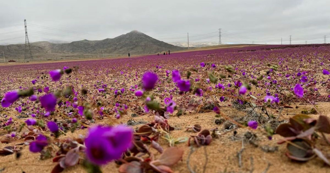 Няколко километра от чилийската пустиня Атакама, която е най-сухата на планетата, са обсипани с лилави и бели цветя заради необичайните за този северен район на страната валежи.