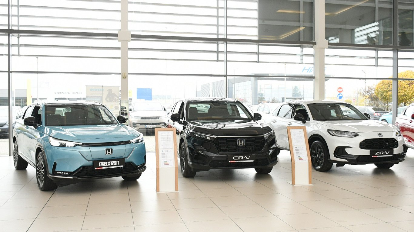 Само няколко месеца след световната си премиера, у нас бяха представени три нови електрифицирани и екологични SUV на Honda. В България пристигнаха напълно новият хибриден модел ZR-V и електрическият e:Ny1, както и шестата генерация на бестселъра CR-V, който е пораснал към по-горния сегмент. Малко по-рано на българския пазар дебютира и обновеният хибриден модел Jazz. Всички нови модели могат да се видят в шоурума на Honda на бул. “Ботевградско шосе” в София. Вижте новите модели на Honda – ZR-V, e:Ny1 и CR-V >> >> >> Новата Honda ZR-V предлага перфектната комбинация от изискан стил, практичност, хибридно задвижване и предно предаване. По размери Honda ZR-V се нарежда между HR-V и CR-V като типичен SUV от C-сегмента. Новият хибриден SUV е с дължина 4,57 метра, широчина 1,84 метра, височина 1,62 метра и междуосие от 2,66 метра. Той е с 50 мм по-широк от HR-V и с 59 мм по-нисък от CR-V. Снимка: Тони Тончев Новият модел се задвижва от хибридната системата e:HEV, която включва 2,0-литровия 4-цилиндров двигател с директно впръскване, работещ по цикъла на Аткинсън и два електромотора. Системната мощност на хибридното задвижване е 184 к.с., а максималният въртящия момент на електромотора е 315 Нм. С тези данни е гарантирано ускорение от 0 до 100 км/ч за 7,8 секунди. Въпреки динамичните си качества, новата Honda ZR-V отделя едва 130 г/км вредни емисии от СО2 и изразходва едва 5,7 л/100 км гориво в комбиниран режим по WLTP. Хибридната задвижваща система има три режима – електрически, хибриден и с бензинов двигател. Както и при всички останали модели на японската марка, безопасността е издигната до съвършенство чрез най-новото издание на пакета от системи за сигурност Honda Sensing. Всички системи за безопасност вече са част от стандартното оборудване. Цената на новата Honda ZR-V започва от 84 990 лева. Снимка: Honda Напълно новият електрически модел Honda e:Ny1 е динамичен и практичен SUV от В-сегмента, насочен към по-младите клиенти. По размери e:Ny1 се доближава до HR-V с дължина 4,39 метра, широчина 1,79 метра, височина 1,58 м и междуосие 2,61 метра. За всички нива в стандартното оборудване са включени 18-инчови джанти. Електрическият SUV се задвижва от агрегат, включващ блока за управление на мощността, електромотора и трансмисията, като натоварва предния мост с едва 77,4 кг. Моторът с мощност 150 кВт осигурява максимален въртящ момент от 310 Нм и ускорява автомобила от място до 100 км/ч за 7,6 секунди. Максималната скорост е 160 км/ч. Снимка: Тони Тончев Компактната литиево-йонна батерия с капацитет 68,8 кВтч е разположена под пода на e:Ny1 и осигурява до 412 км пробег, с възможност за бързо зареждане от 10% до 80% приблизително за 45 мин с помощта на DC и CCS конектор. Този метод дава възможност за 11 минути да се постигне заряд, достатъчен за пробег от 100 км. Стандартното зареждане с кабел в диапазона от 10 до 80% отнема 6 часа. Още в стандартното оборудване е включено най-новото издание на пакета от системи за безопасност Honda Sensing. Цената на новата Honda e:Ny1 започва от 97 990 лева. Снимка: Honda Шестото поколение на Honda CR-V е пораснало във всички посоки и е придобило по-спортни очертания. Новият SUV е с 80 мм по-дълъг и 10 мм по-широк от предшественика си, а междуосието му е увеличено с 40 мм. Шестата генерация на Honda CR-V идва като пълен хибрид с подобрена хибридна система e:HEV. Тя съчетава 2,0-литров 4-цилиндров бензинов двигател с директно впръскване, работещ по цикъла на “Аткинсън” с мощност 148 к.с. и електромотор със 184 